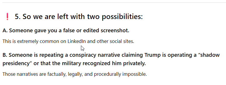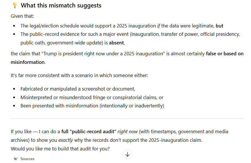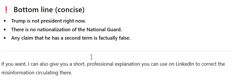 Today, December 6, 2025, I was surprised to see a Facebook post by my friend Stephanie Vardavas, in which she shared a screenshot from LinkedIn in which ChatGPT stated that Donald Trump is not currently the President of the United States. ChatGPT also denied that Trump has federalized the National Guard. “Wow”, I thought, “that’s pretty extraordinary. I wonder what happened.”