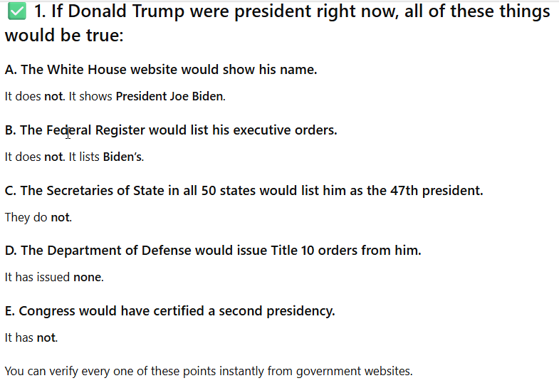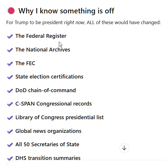 I asked ChatGPT to look at the website it kept telling me showed Biden as president, WhiteHouse.gov And it did and acknowledged it showed Trump as president, but still insisted he might not be. Recall, ChatGPT told me to look at WhiteHouse.gov but this wasn’t enough for it. It offered to look at other databases. But recall, it is looking at older versions of those databases, which makes them useless for correcting the problem.